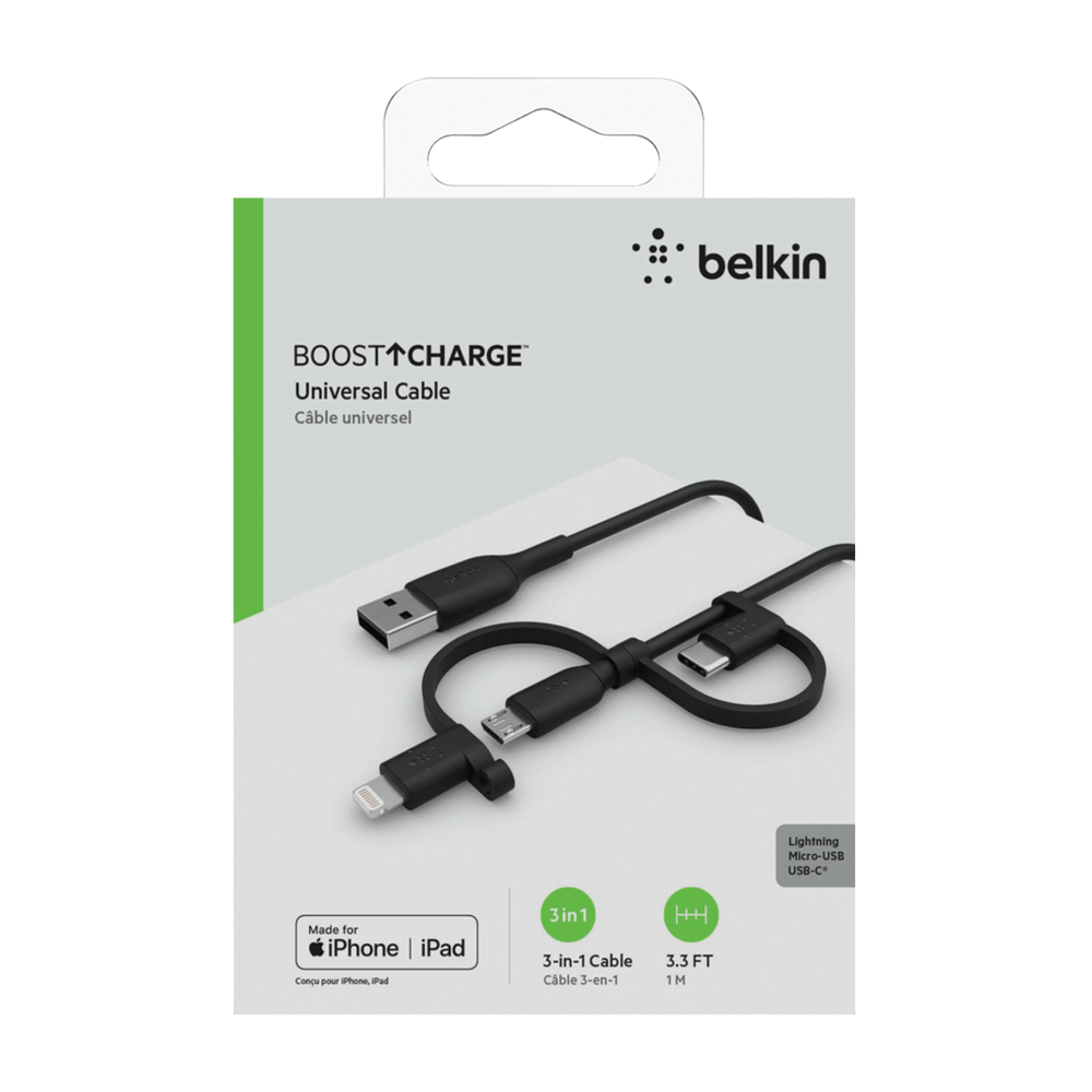 بيلكن كيبل شحن معتمد 3 في 1 - ايفون ومايكرو ويواس بي سي الي يواس بي - متر - اسود